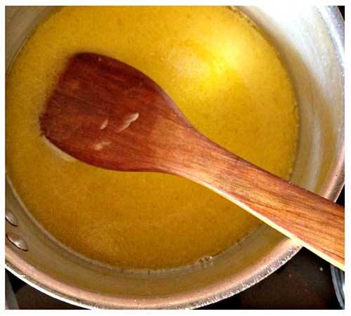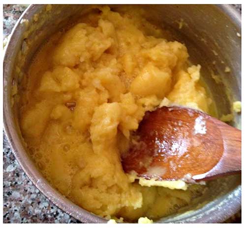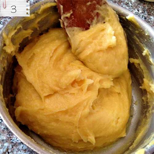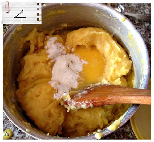 4. Enlever la casserole du feu, puis ajouter les œufs légèrement battus, ajouter la vanille, et mélanger vivement a la cuillère.
