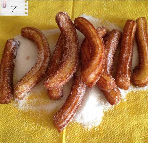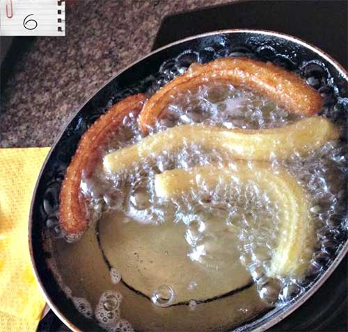 6. Préparer l’huile de friture dans une poêle et chauffer a feu doux, une fois l'huile bien chaude, frire des bâtonnets de la longueur que vous voulez ( ça dépendra de la taille de la poêle aussi) 2min environ de chaque côté, surtout a feu doux c'est très important, sinon les churros vont dorer mais rester crus a l'intérieur.